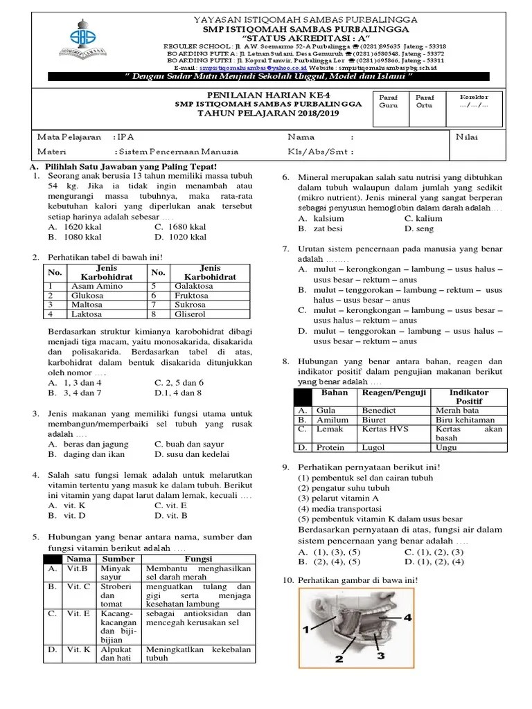 Ilmu pengetahuan alam kelas viii smp/mts edisi revisi 2017. Artikel materi soal bioligi kelas 8 tingkat smp/mts, tahun 2021 soal pg, essay, pelajaran biologi untuk semester 1 dan semester 2. Berikut soal dan kunci jawaban ulangan harian ilmu pengetahuan alam (ipa) kelas 8 smp tentang sistem pencernaan manusia di semester 1. Pembaca sekolahmuonline, berikut ini kami sajikan . Apa fungsi makanan bagi manusia ? Sistem pencernaan pada manusialatihan soal bila mengunyah nasi tawar lama lama akan terasa manis sebab dalam air liur terdapat . Contoh soal sistem pencernaan dalam biologi . Mendeskripsikan sistem pencernaan serta keterkaitannya dengan sistem pernapasan, sistem peredaran darah, dan penggunaan energi makanan. Sistem pencernaan makanan kelas viii smp. Menganalisis perbedaan saluran pencernaan dan kelenjar pencernaan pada sistem pencernaan,. Puji syukur saya panjatkan pada allah swt atas berkat, rahmat dan. Smp negeri satu atap bonne. Sistem pencernaan pada manusia tersusun oleh saluran pencernaan dan.